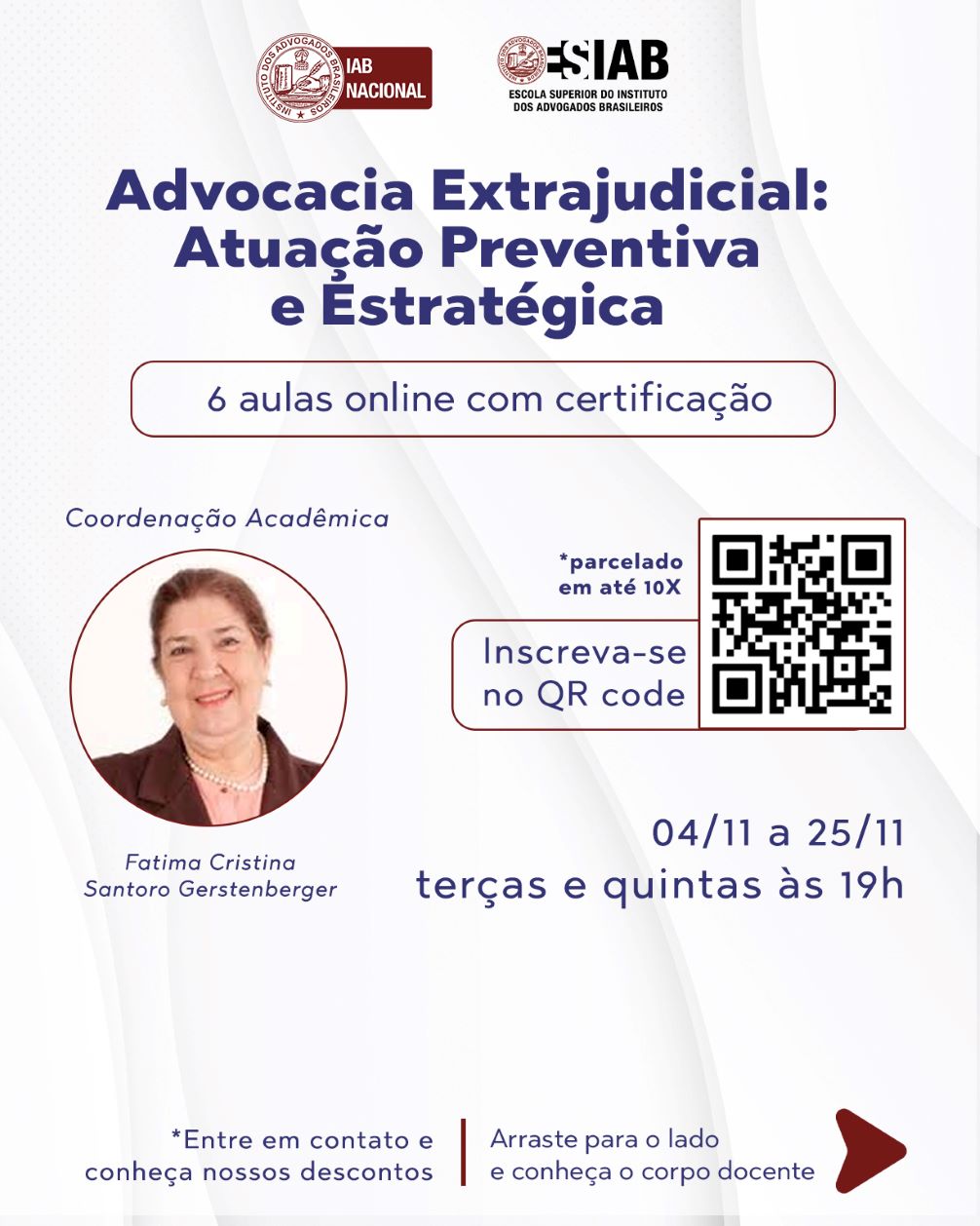 Destaque Mural Curso da Esiab sobre uso de instrumentos da advocacia extrajudicial está com inscrições abertas IAB dá posse a novos associados do Maranhão e homenageia presidente da OAB/MA Casa de Montezuma é representada em cerimônia de recondução do procurador-chefe do MPT-RJ Corregedor do TRT-MA recebe membros da diretoria do IAB em seu gabinete Plenária Pareceres Notícias 24/10/2025 Curso da Esiab sobre uso de instrumentos da advocacia extrajudicial está com inscrições abertas 23/10/2025 IAB dá posse a novos associados do Maranhão e homenageia presidente da OAB/MA Ver todas Cursos Eventos VITRINE / APOIADORES E PARCEIROS Apoiadores Ver todos Parceiros Ver todos Papo com o IAB Live