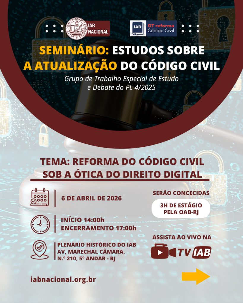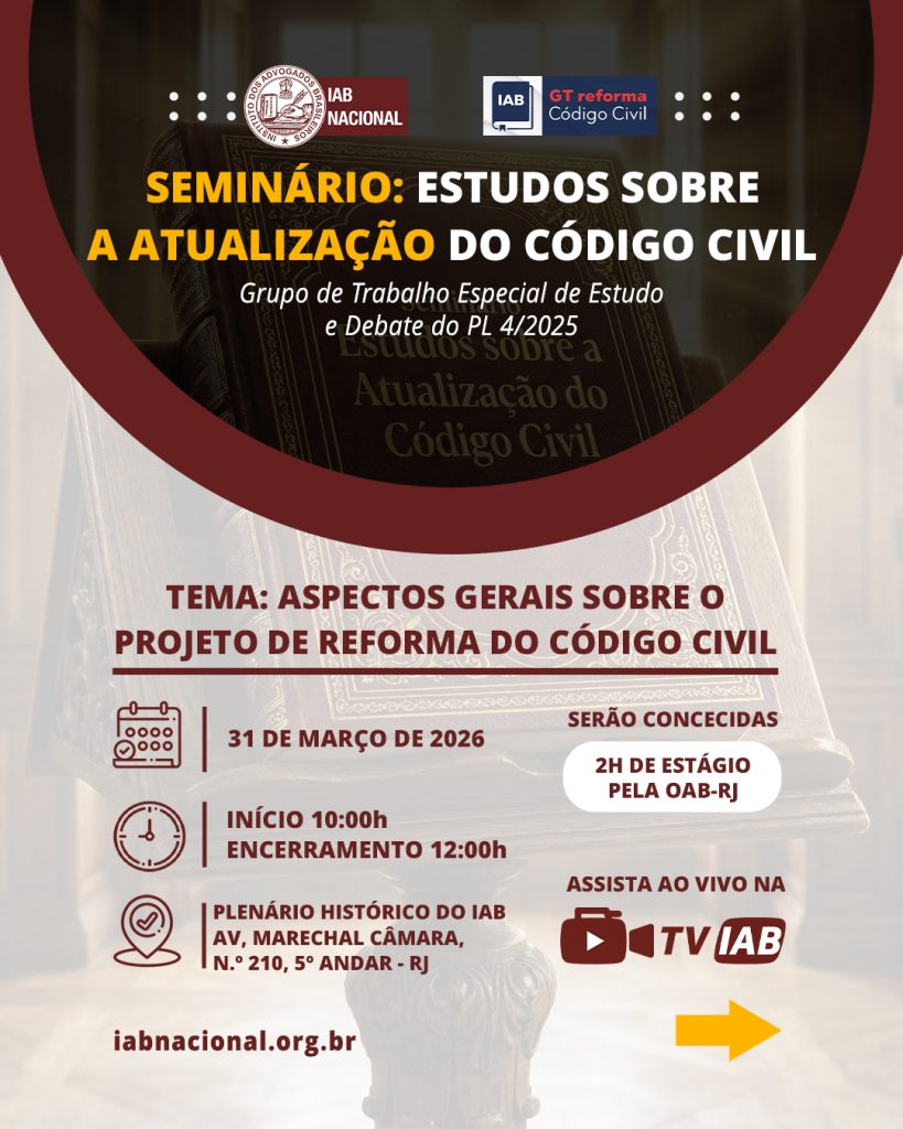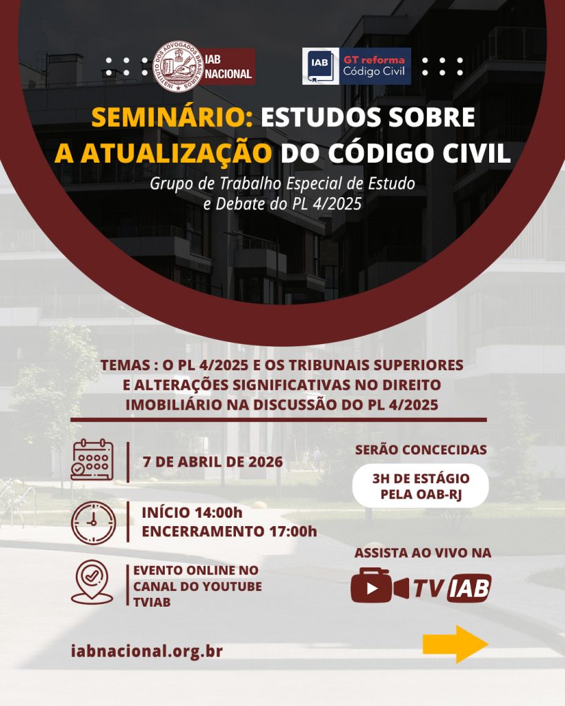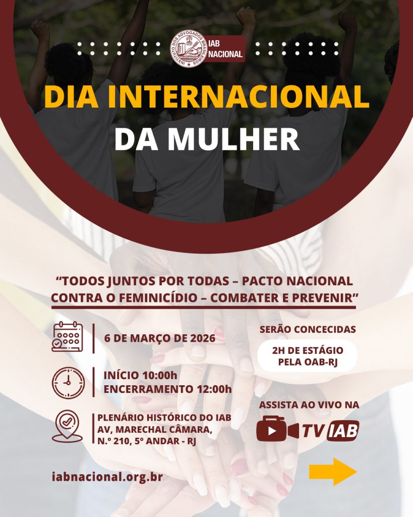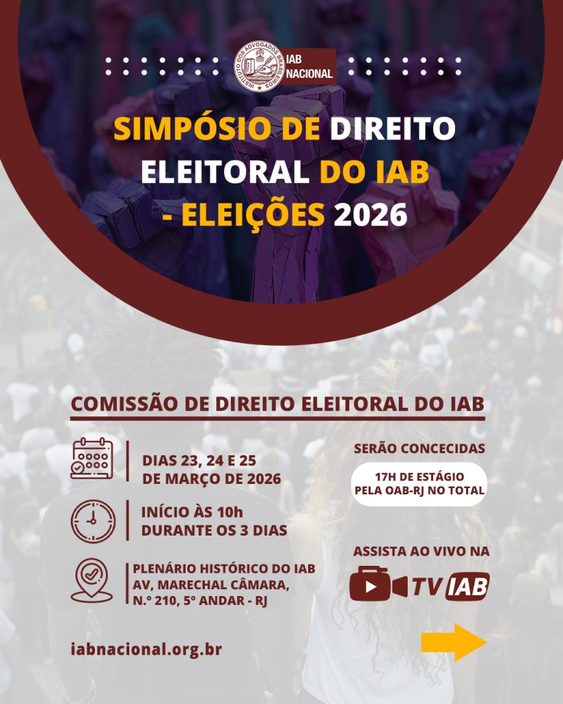 Destaque Mural Em artigo na Revista Justiça & Cidadania, membro do IAB analisa relação entre COP30 e direitos humanos Beto Simonetti e Marcus Vinicius Furtado Coêlho visitam plenário histórico do IAB IAB homenageia Marcus Vinicius Furtado Coêlho com a outorga da Medalha Montezuma Liberdade de expressão nos EUA é privilegiada como condição necessária para a democracia, diz advogado Plenária Pareceres Notícias 15/12/2025 Em artigo na Revista Justiça & Cidadania, membro do IAB analisa relação entre COP30 e direitos humanos 13/12/2025 Beto Simonetti e Marcus Vinicius Furtado Coêlho visitam plenário histórico do IAB Ver todas Cursos Eventos VITRINE APOIADORES E PARCEIROS Apoiadores Ver todos Parceiros Ver todos Papo com o IAB Live