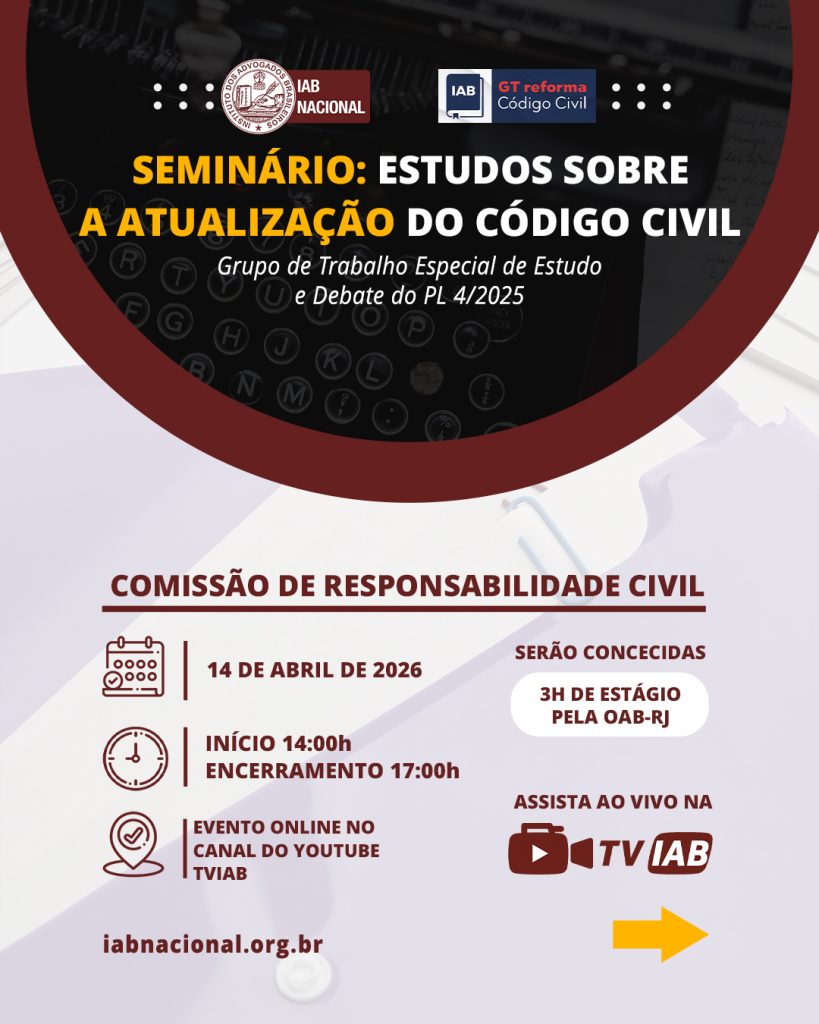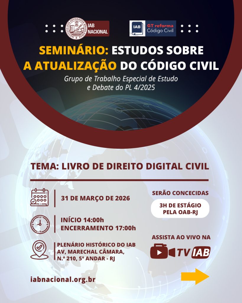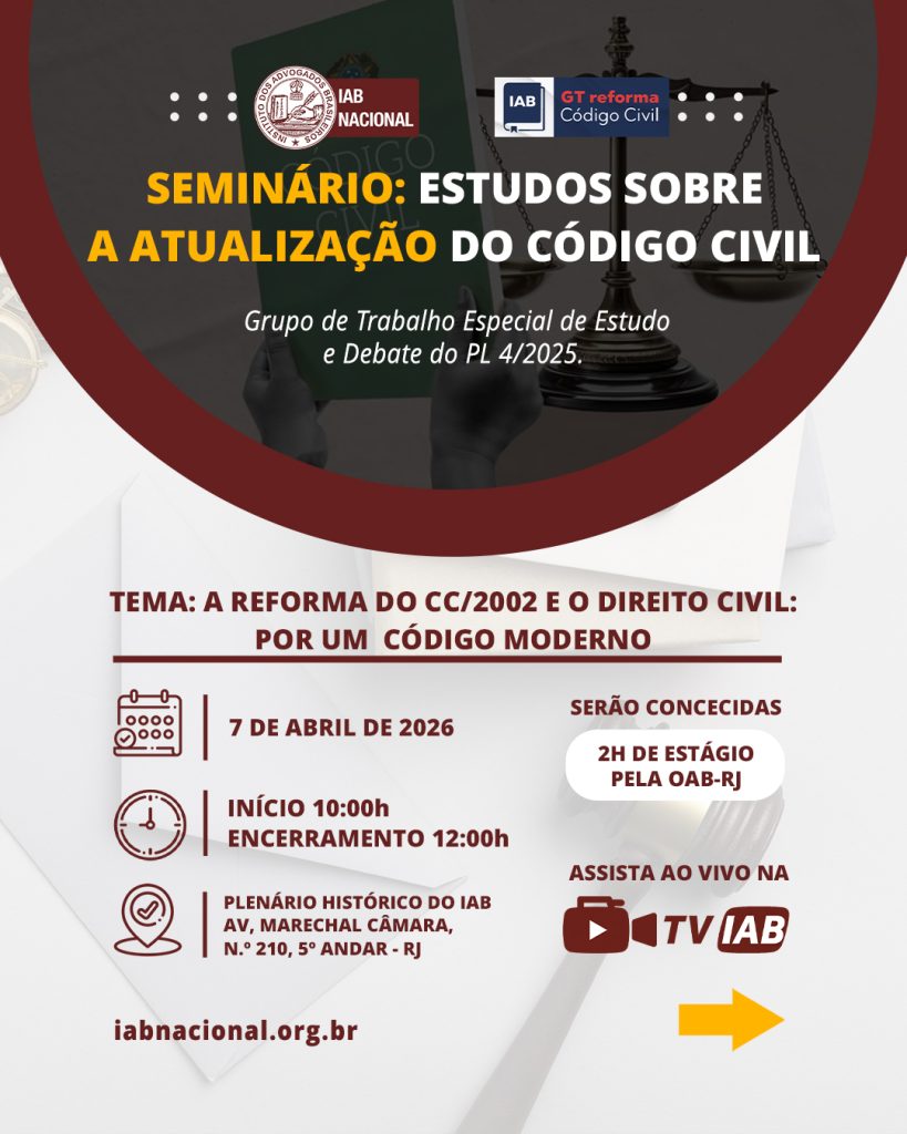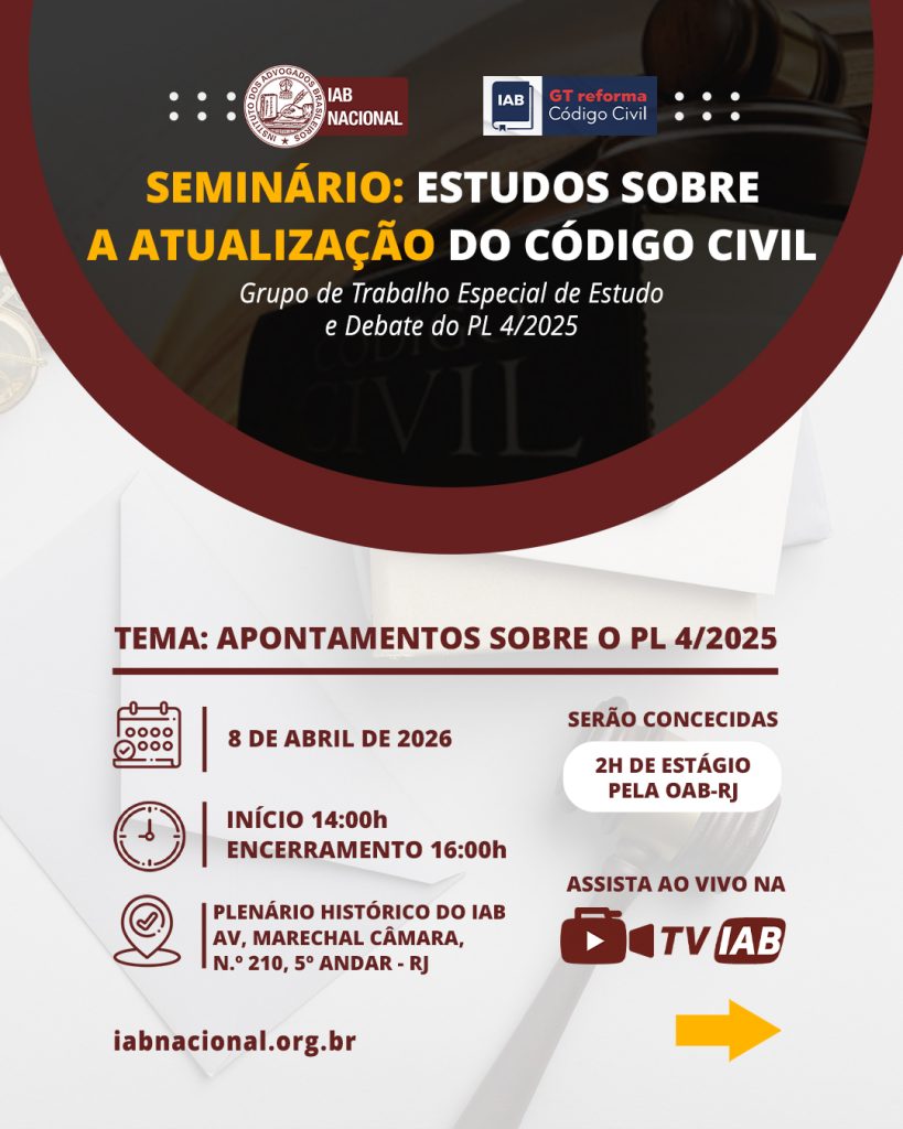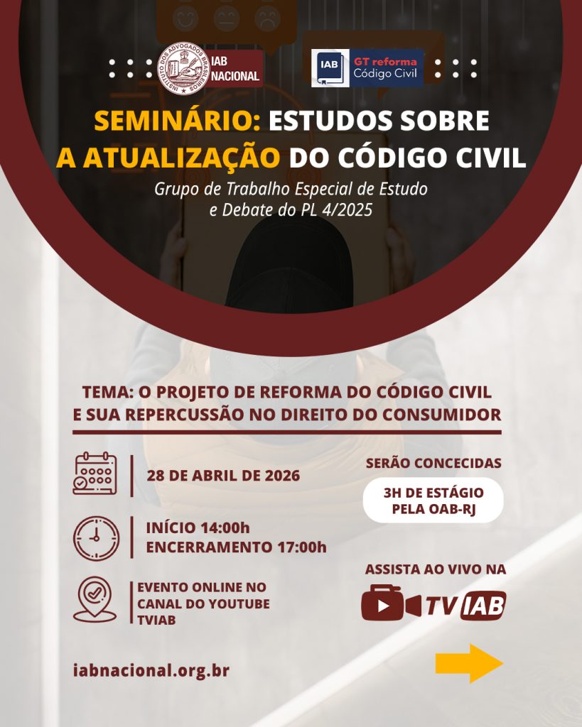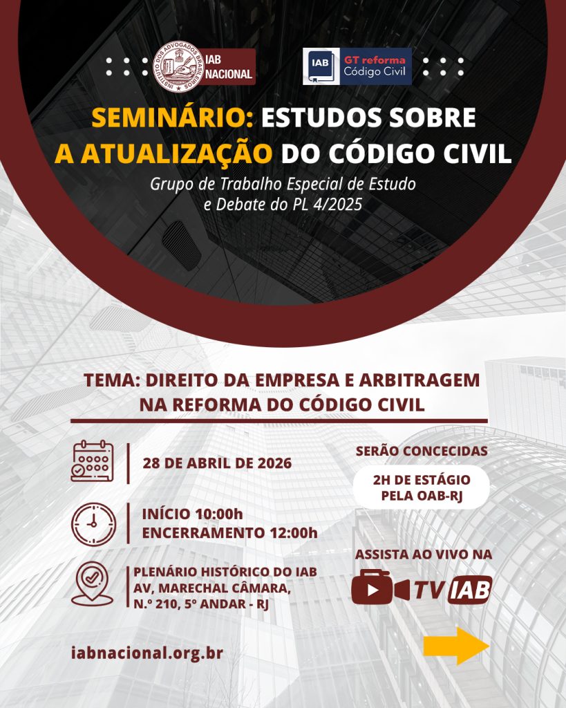 Destaque Mural Em artigo na Revista Justiça & Cidadania, membro do IAB analisa relação entre COP30 e direitos humanos Beto Simonetti e Marcus Vinicius Furtado Coêlho visitam plenário histórico do IAB IAB homenageia Marcus Vinicius Furtado Coêlho com a outorga da Medalha Montezuma Liberdade de expressão nos EUA é privilegiada como condição necessária para a democracia, diz advogado Plenária Pareceres Notícias 15/12/2025 Em artigo na Revista Justiça & Cidadania, membro do IAB analisa relação entre COP30 e direitos humanos 13/12/2025 Beto Simonetti e Marcus Vinicius Furtado Coêlho visitam plenário histórico do IAB Ver todas Cursos Eventos VITRINE APOIADORES E PARCEIROS Apoiadores Ver todos Parceiros Ver todos Papo com o IAB Live