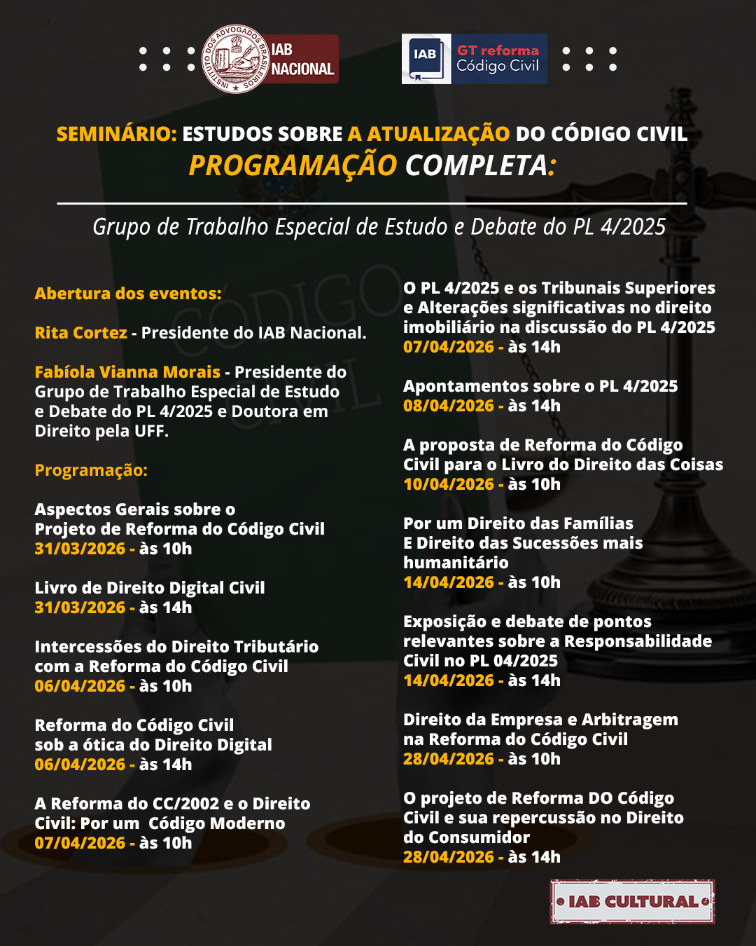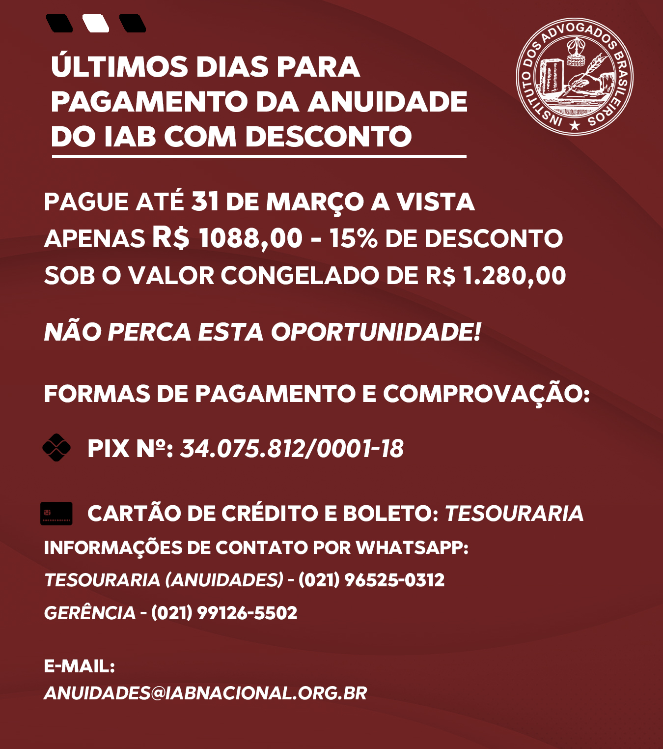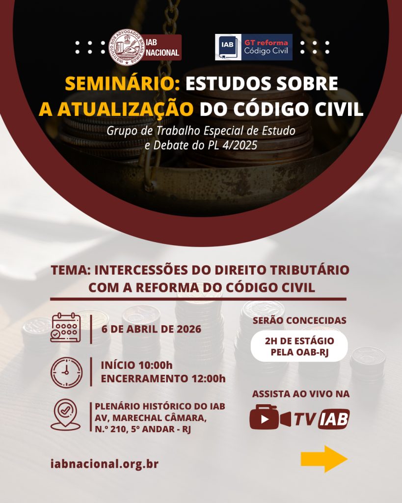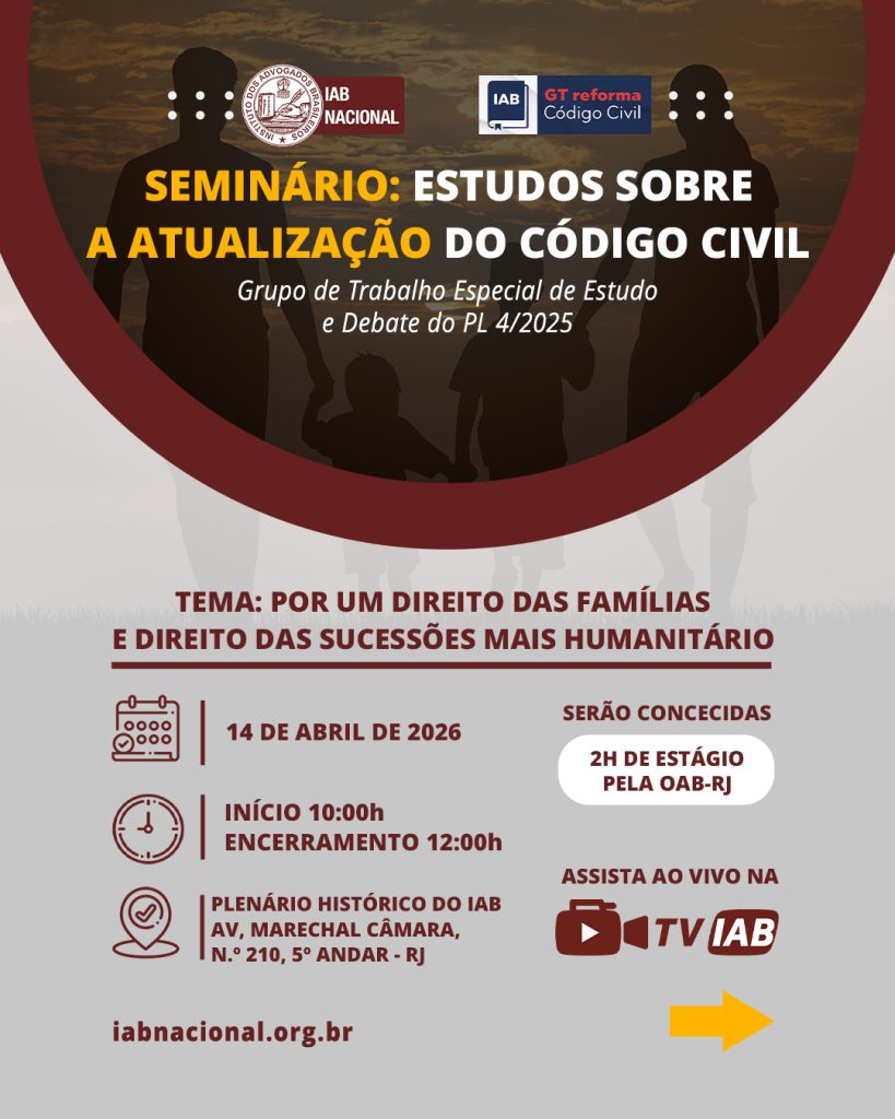 Destaque Mural Em artigo na Revista Justiça & Cidadania, membro do IAB analisa relação entre COP30 e direitos humanos Beto Simonetti e Marcus Vinicius Furtado Coêlho visitam plenário histórico do IAB IAB homenageia Marcus Vinicius Furtado Coêlho com a outorga da Medalha Montezuma Liberdade de expressão nos EUA é privilegiada como condição necessária para a democracia, diz advogado Plenária Pareceres Notícias 15/12/2025 Em artigo na Revista Justiça & Cidadania, membro do IAB analisa relação entre COP30 e direitos humanos 13/12/2025 Beto Simonetti e Marcus Vinicius Furtado Coêlho visitam plenário histórico do IAB Ver todas Cursos Eventos VITRINE APOIADORES E PARCEIROS Apoiadores Ver todos Parceiros Ver todos Papo com o IAB Live