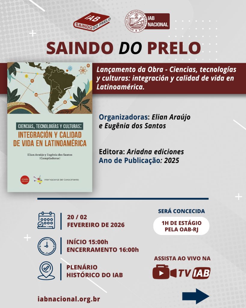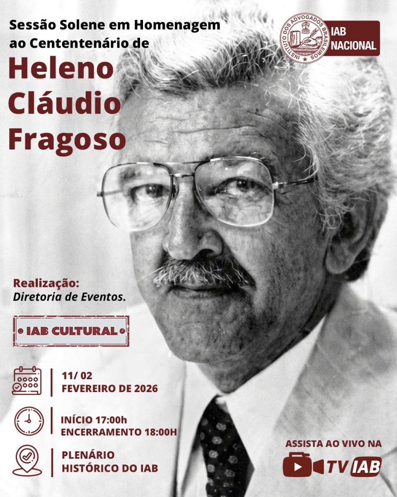 Destaque Mural Primeira sessão do Conselho Pleno da OAB é acompanhada por presidente do Instituto dos Advogados Presidente do IAB participa de abertura do Ano Judiciário de 2026, realizada no STF Lançamento de Cartilha da ABA sobre golpe do falso advogado tem participação do IAB Cooperação com o Japão contribuiu para o protagonismo basileiro na exportação de soja, ressalta diplomata Plenária Pareceres Notícias 02/02/2026 Primeira sessão do Conselho Pleno da OAB é acompanhada por presidente do Instituto dos Advogados 02/02/2026 Presidente do IAB participa de abertura do Ano Judiciário de 2026, realizada no STF Ver todas Cursos Eventos VITRINE APOIADORES E CONVÊNIOS Apoiadores Ver todos Convênios Ver todos Papo com o IAB Live
