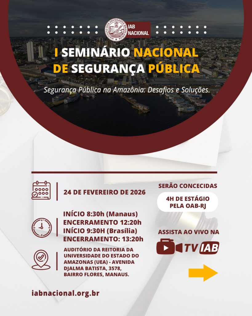 Destaque Mural Livro que reúne trabalhos sobre integração latinoamericana será lançado no IAB Instituto dos Advogados apoia PL que impede cônjuge agressor de receber bens da vítima IAB pede rejeição integral a projetos que ampliam hipóteses de legítima defesa Desembargador de SP e advogados do RJ tomam posse na Casa de Montezuma Plenária Pareceres Notícias 13/02/2026 Livro que reúne trabalhos sobre integração latinoamericana será lançado no IAB 11/02/2026 Instituto dos Advogados apoia PL que impede cônjuge agressor de receber bens da vítima Ver todas Cursos Eventos VITRINE APOIADORES E CONVÊNIOS Apoiadores Ver todos Convênios Ver todos Papo com o IAB
