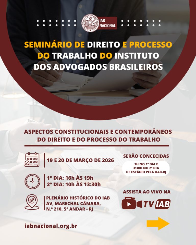 Destaque Mural Sugestões do IAB para código de conduta da magistratura e aprimoramento institucional foram entregues aos presidentes do STF e TST Cultura judicial ainda impede avanço da mediação em cartórios, apesar de previsão legal CFOAB aprova proposição da presidente do IAB para ingresso em ação no STF sobre auxílio-doença a gestantes de alto risco Livro lançado no IAB pode ajudar gestores na construção de melhores condições de trabalho Plenária Pareceres Notícias 10/03/2026 Sugestões do IAB para código de conduta da magistratura e aprimoramento institucional foram entregues aos presidentes do STF e TST 10/03/2026 Cultura judicial ainda impede avanço da mediação em cartórios, apesar de previsão legal Ver todas Cursos Eventos VITRINE APOIADORES E CONVÊNIOS Apoiadores Ver todos Convênios Ver todos Papo com o IAB