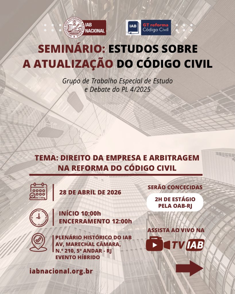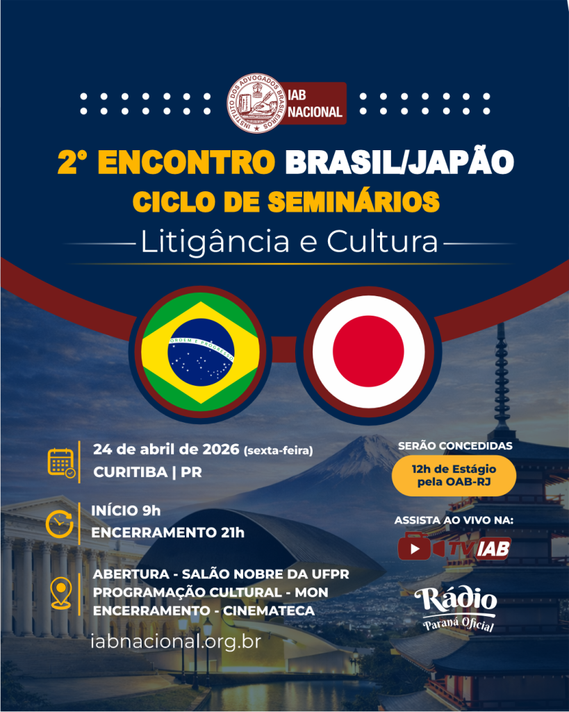 Destaque Prioridade na efetivação do direitos indígenas é defendida pelo Instituto dos Advogados Em seminário preparatório para congresso do IAB, advogado defende humanização das decisões judiciais Livros que retratam memórias da ditadura e anistia política são lançados no Instituto dos Advogados Presidente do Sinsa visita sede histórica do Instituto dos Advogados Brasileiros Mural Plenária Pareceres Notícias 19/04/2026 Prioridade na efetivação do direitos indígenas é defendida pelo Instituto dos Advogados 17/04/2026 Em seminário preparatório para congresso do IAB, advogado defende humanização das decisões judiciais Ver todas Eventos Cursos VITRINE APOIADORES E CONVÊNIOS Apoiadores Ver todos Convênios Ver todos PRODUÇÕES IAB Papo com o IAB