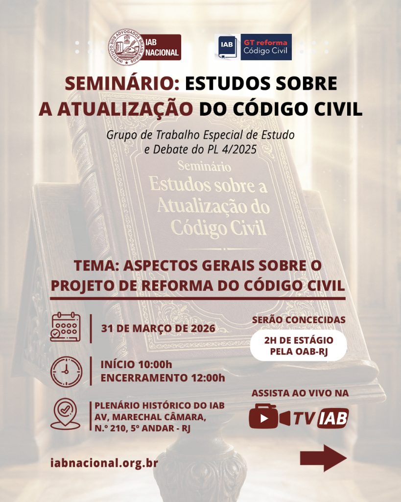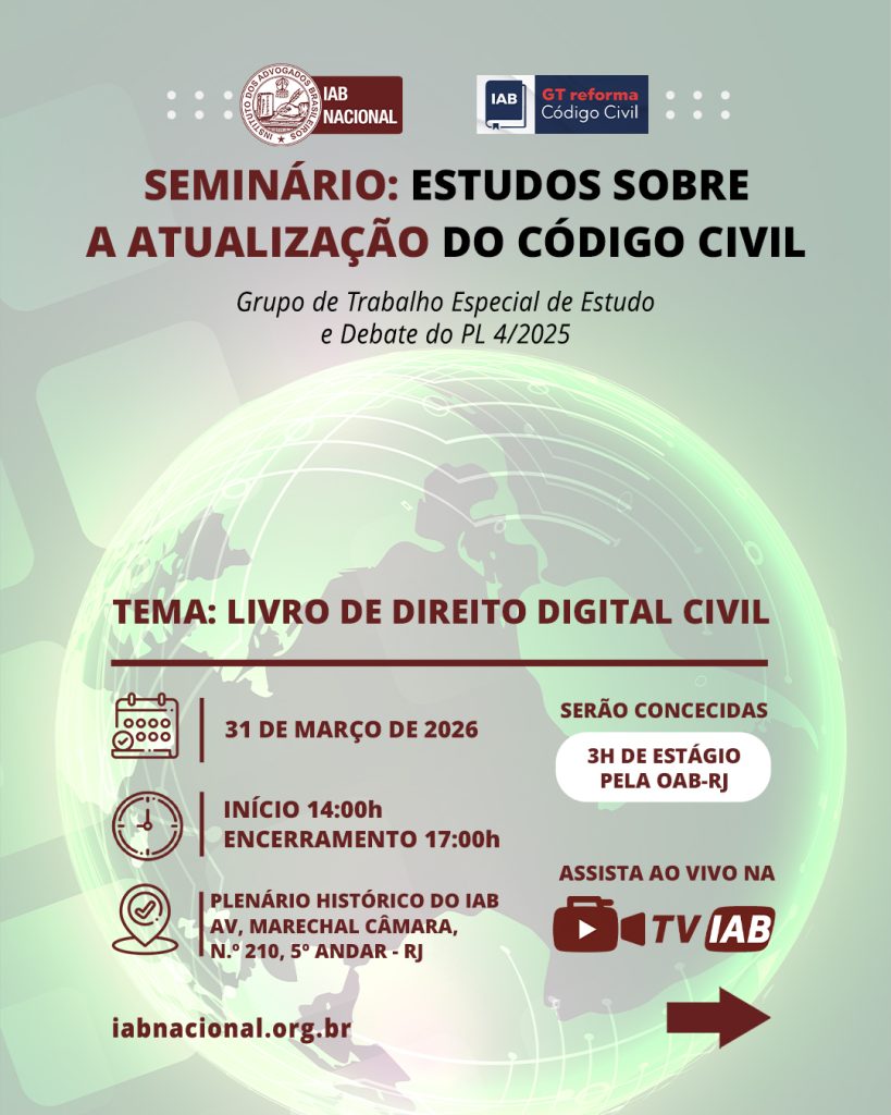 Destaque Mural Bruna Martins representa a Casa de Montezuma na sessão de abertura do Ano Acadêmico do IHGB IAB apoia projeto que reconhece família multiespécie e amplia proteção jurídica aos animais Presidente da Aasp visita sede do Instituto dos Advogados, no Rio de Janeiro Quatro advogados tomam posse como membros efetivos da Casa de Montezuma Plenária Pareceres Notícias 19/03/2026 Bruna Martins representa a Casa de Montezuma na sessão de abertura do Ano Acadêmico do IHGB 18/03/2026 IAB apoia projeto que reconhece família multiespécie e amplia proteção jurídica aos animais Ver todas Cursos Eventos VITRINE APOIADORES E CONVÊNIOS Apoiadores Ver todos Convênios Ver todos Papo com o IAB