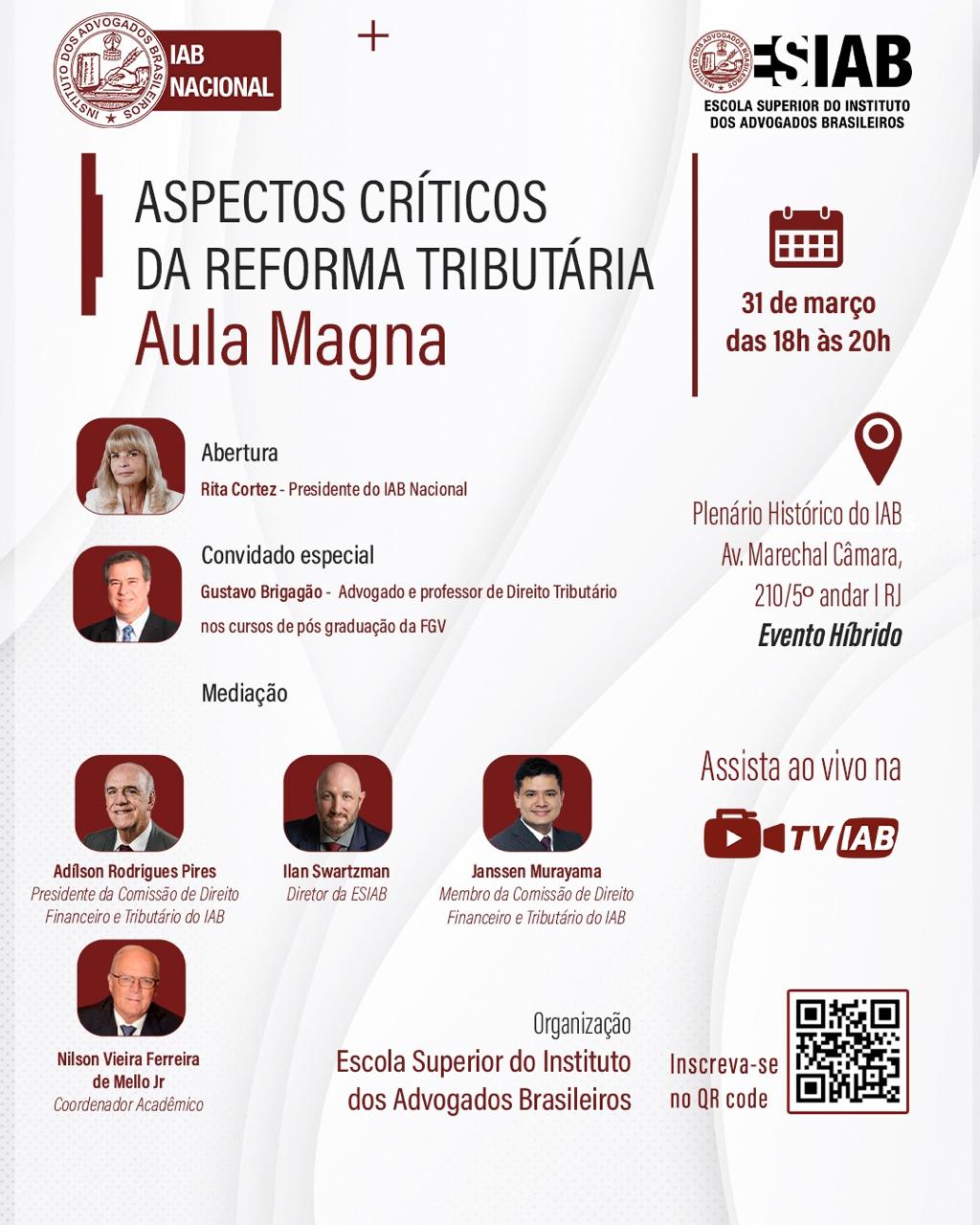Destaque Representante do IAB em São Paulo participa de posse da nova diretoria da UIA Aula gratuita da Esiab sobre aspectos críticos da reforma tributária inicia novo curso; Inscrições estão abertas Evento da Abami para celebrar lideranças femininas da advocacia homenageia Rita Cortez IAB lança livro que oferece manual prático para a atuação no Direito Previdenciário Mural Plenária Pareceres Notícias 27/03/2026 Representante do IAB em São Paulo participa de posse da nova diretoria da UIA 27/03/2026 Aula gratuita da Esiab sobre aspectos críticos da reforma tributária inicia novo curso; Inscrições estão abertas Ver todas Eventos Cursos VITRINE APOIADORES E CONVÊNIOS Apoiadores Ver todos Convênios Ver todos PRODUÇÕES IAB Papo com o IAB
