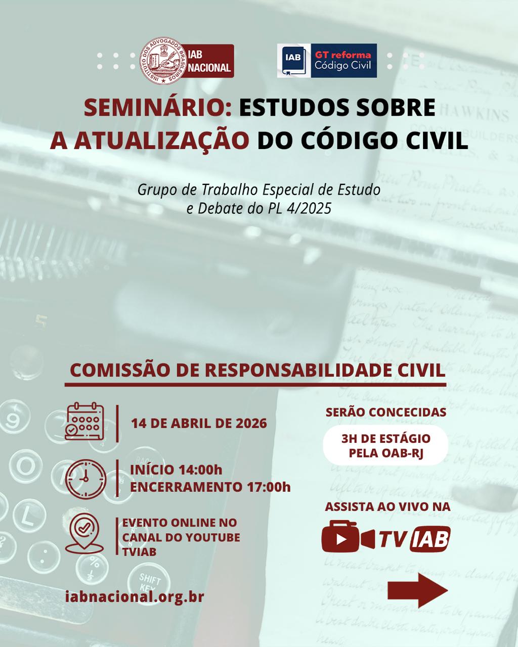 Destaque Teor crítico e profundidade compõem Manual de História do Direito, lançado no IAB Instituto dos Advogados realizará seminário sobre Direito, inovação e sustentabilidade Humanização do Direito das Famílias e Sucessões na reforma do Código Civil será debatida no IAB IAB promoverá seminário sobre responsabilidade civil na reforma do Código Civil Mural Plenária Pareceres Notícias 09/04/2026 Teor crítico e profundidade compõem Manual de História do Direito, lançado no IAB 09/04/2026 Instituto dos Advogados realizará seminário sobre Direito, inovação e sustentabilidade Ver todas Eventos Cursos VITRINE APOIADORES E CONVÊNIOS Apoiadores Ver todos Convênios Ver todos PRODUÇÕES IAB Papo com o IAB
