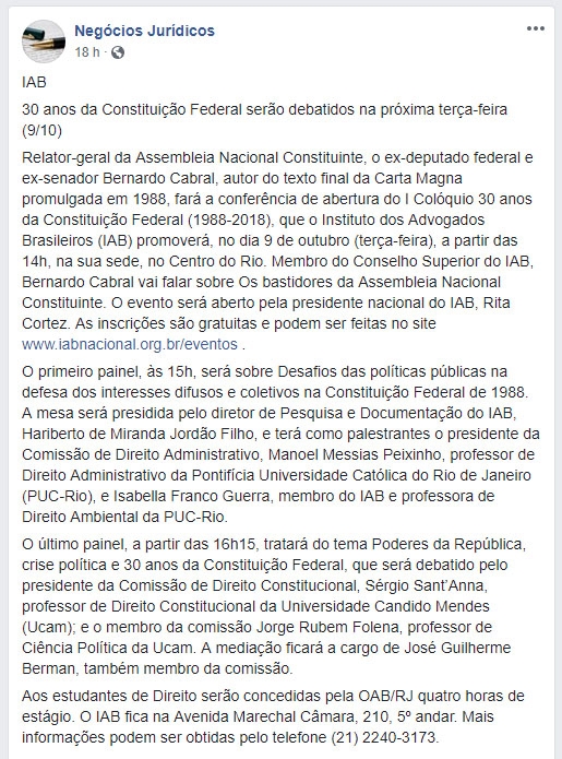 Início » IAB na imprensa » 30 anos da Constituição Federal serão debatidos no IAB
