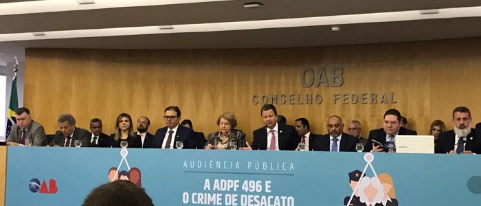 De acordo com o Conselho Federal da OAB, que ingressou no Supremo Tribunal Federal (STF) com a Arguição de Descumprimento de Preceito Fundamental (ADPF) 496, o dispositivo do CP é incompatível com a ordem constitucional vigente. Na sua exposição, Técio Lins e Silva afirmou que “o crime de desacato não se coaduna com a democracia, afronta o direito à liberdade de expressão e diz respeito diretamente à advocacia, que sofre com ele”.