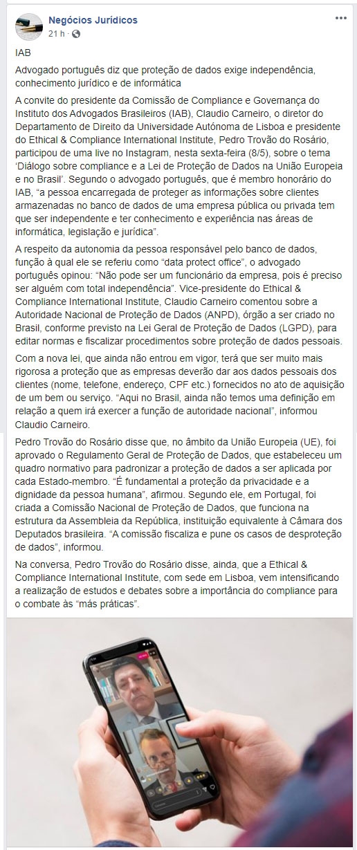 Início » IAB na imprensa » Advogado português diz que proteção de dados exige independência, conhecimento jurídico e de informática