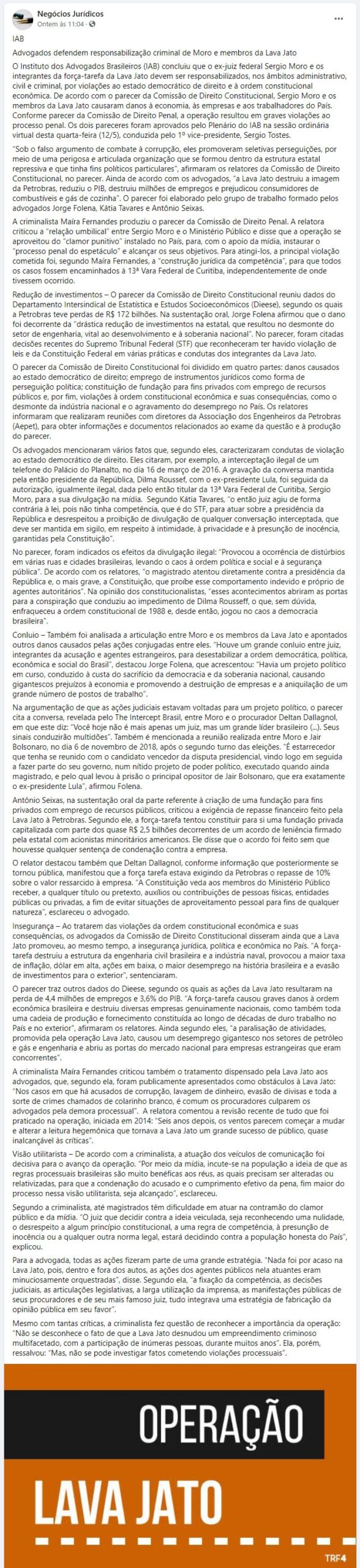Início » IAB na imprensa » Advogados defendem responsabilização criminal de Moro e membros da Lava Jato