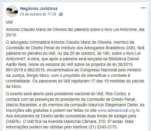 Início » IAB na imprensa » Antonio Claudio Mariz de Oliveira faz palestra sobre o livro Lei Anticrime?. dia 29/10/2019