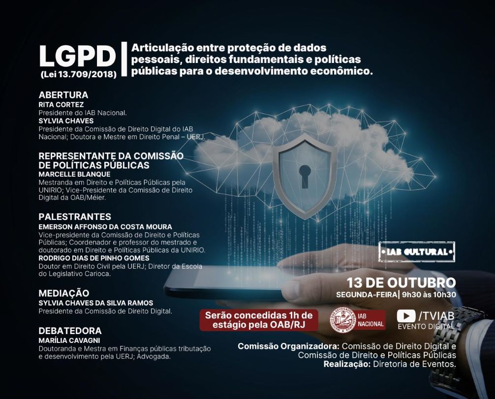 A articulação entre proteção de dados pessoais, direitos fundamentais e políticas públicas para o desenvolvimento econômico será debatida no evento sobre a Lei Geral de Proteção de Dados Pessoais, que será promovido pelo Instituto dos Advogados Brasileiros (IAB) na próxima segunda-feira (13/10), das 9h30 às 10h30. A abertura será feita pelas presidentes nacional da Casa de Montezuma, Rita Cortez, e da Comissão de Direito Digital, Sylvia Chaves. O webinar contará com transmissão pela TVIAB no Youtube.