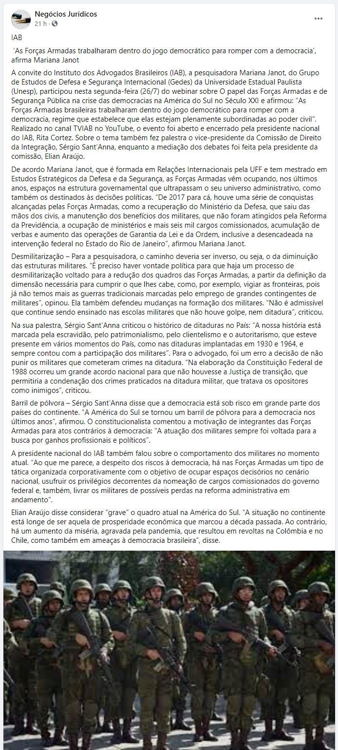 Início » IAB na imprensa » ‘As Forças Armadas trabalharam dentro do jogo democrático para romper com a democracia’, afirma Mariana Janot