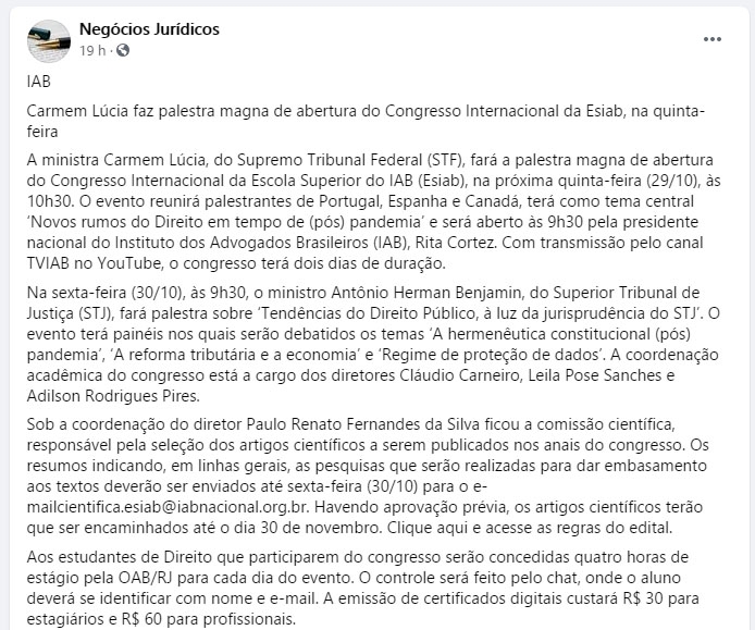 Carmem Lúcia faz palestra magna de abertura do Congresso Internacional da Esiab, na quinta-feira