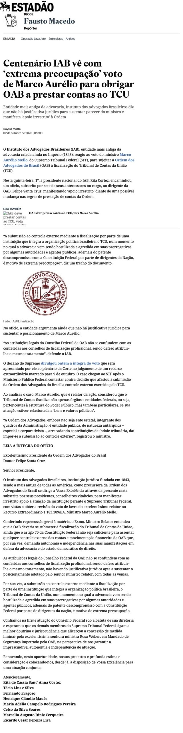 Início » IAB na imprensa » Centenário IAB vê com ‘extrema preocupação’ voto de Marco Aurélio para obrigar OAB a prestar contas ao TCU