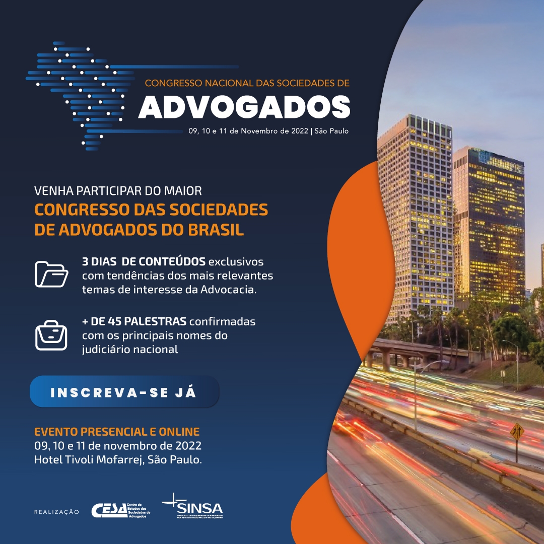 De 9 a 11 de novembro acontece na capital paulista o maior evento de âmbito nacional reunindo escritórios de advocacia: O Congresso Nacional de Sociedades de Advogados, organizado pelo Centro de Estudos das Sociedades de Advogados (Cesa) e pelo Sindicato das Sociedades de Advogados dos Estados de São Paulo e Rio de Janeiro (Sinsa). O evento terá lugar no Hotel Tivoli Moffarej, na região da Avenida Paulista, e espera reunir cerca de mil participantes, entre juristas, membros do Judiciário, da Câmara dos Deputados e do Senado, além de profissionais das sociedades de advogados de todo o País, assim como advogados que integram departamentos jurídicos das maiores empresas do Brasil.