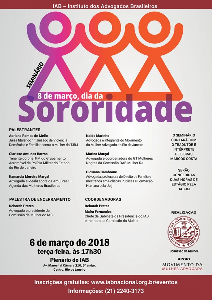 A Comissão da Mulher do Instituto dos Advogados Brasileiros (IAB) realizará no dia 6 de março (terça-feira), às 17h30, no plenário do IAB, seminário em homenagem ao Dia da Sororidade, comemorado no dia 8 de março. O evento, que conta com o apoio do Movimento da Mulher Advogada, tem a coordenação da presidente da Comissão da Mulher, Deborah Prates, que fará a palestra de encerramento, e da chefe de Gabinete da Presidência do IAB, Maíra Fernandes, membra da comissão.