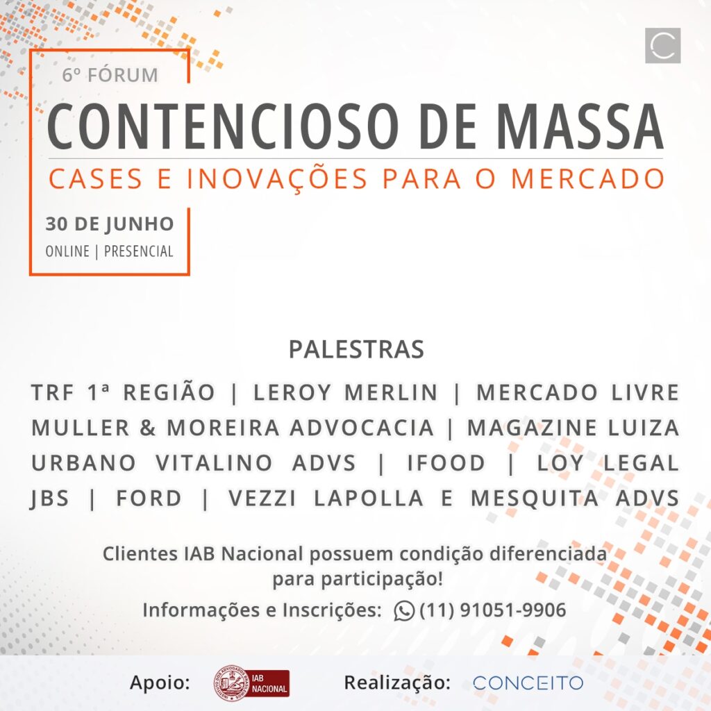 “O Fórum Nacional Contencioso de Massa terá sua 6ª edição em um dia prático de cases e conteúdo inovador, dia 30 de junho – presencial, em SP, e online com transmissão ao vivo, com mais de 100 líderes jurídicos.