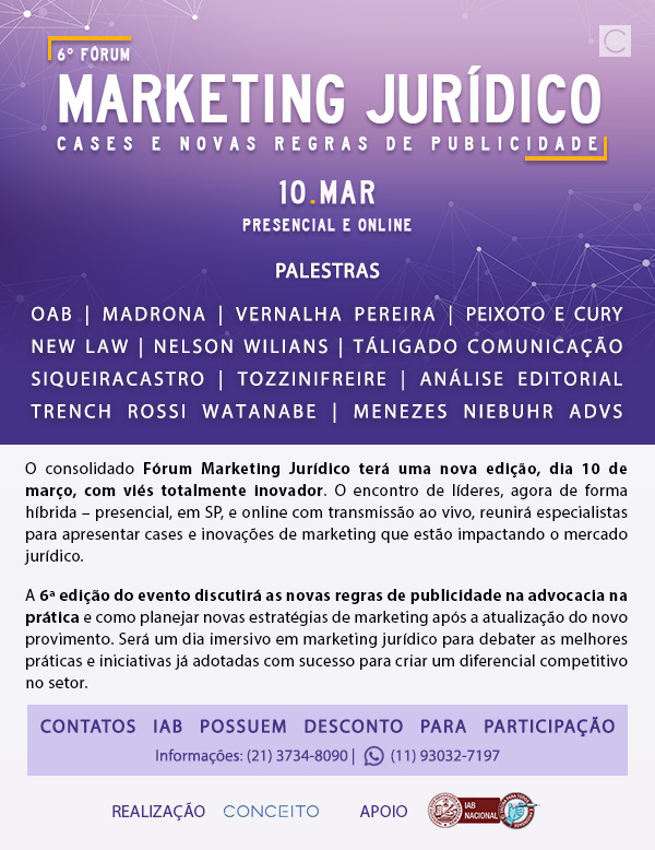 Início » Eventos » Eventos parceiros » 2022 Parceiros » Março » [CONCEITO] 6º FÓRUM MARKETING JURÍDICO | CASES E INOVAÇÕES PARA O MERCADO