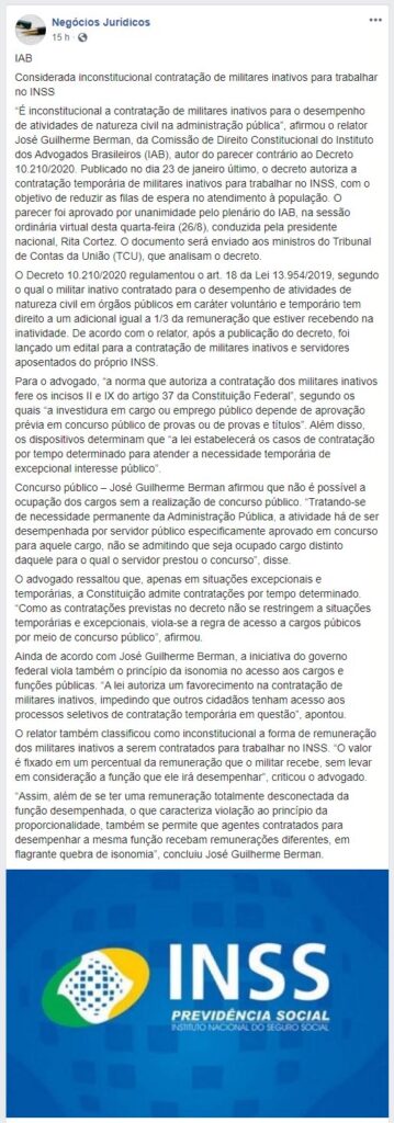 Início » IAB na imprensa » Considerada inconstitucional contratação de militares inativos para trabalhar no INSS
