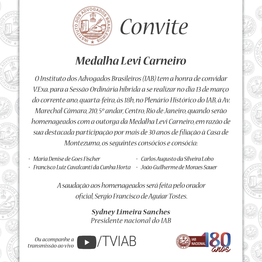 O IAB – Institudo dos Advogados Brasileiros tem a honra de convidar V. Exa. para a Sessão Ordinária híbrida a se realizar no dia 13 de março do corrente ano , quarta-feira às 18horas , no Plenário Histórico do IAB, à Avenida Marechal Câmara, 210 , 5º andar, Centro, Rio de Janeiro, quando serão homenageados com a outorga da Medalha Levi Carneiro , em razão de sua destacada participação por mais de 30 anos de filiação à casa de Montezuma, os seguintes consócios e consócia: