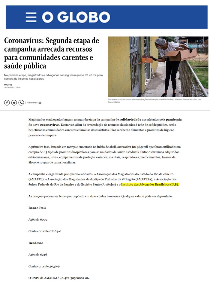 Início » IAB na imprensa » Coronavirus: segunda etapa da campanha arrecada recursos para comuniades carentes e saúde pública