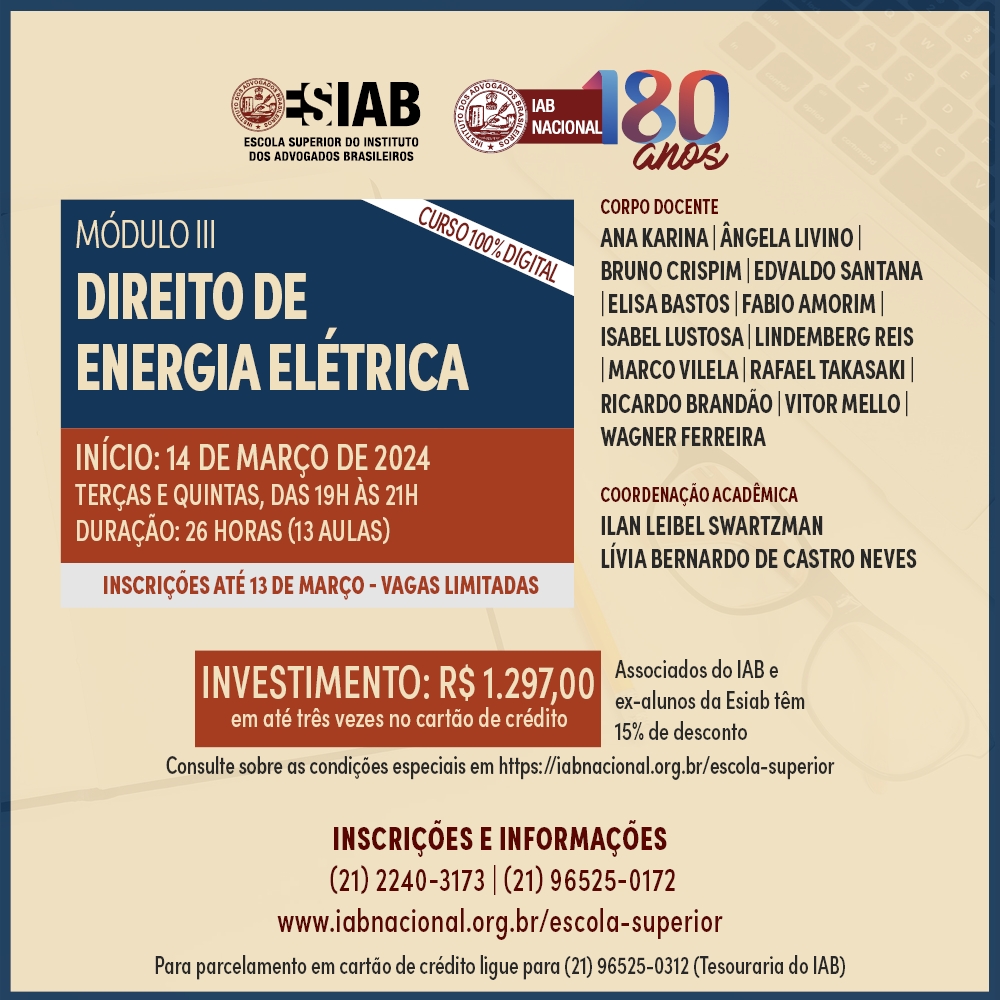 Início » Eventos » Eventos Institucionais » 2024 » Março 2024 » CURSOS ESIAB – Direito de Energia Elétrica – Módulo III