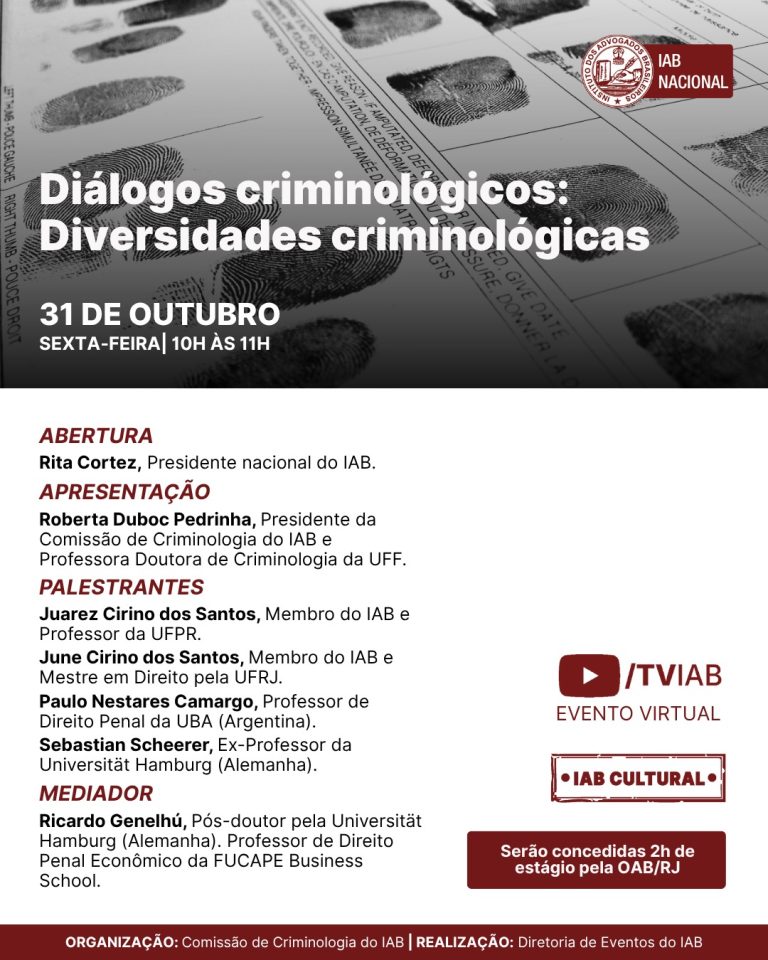 O Instituto dos Advogados Brasileiros (IAB) promoverá, nesta sexta-feira (31/10), às 10h, o evento Diálogos criminológicos: Diversidades criminológicas, que reunirá estudiosos do Brasil, Argentina e Alemanha em um debate virtual transmitido pelo canal TVIAB no YouTube. A abertura será feita pela presidente nacional da Casa de Montezuma, Rita Cortez.