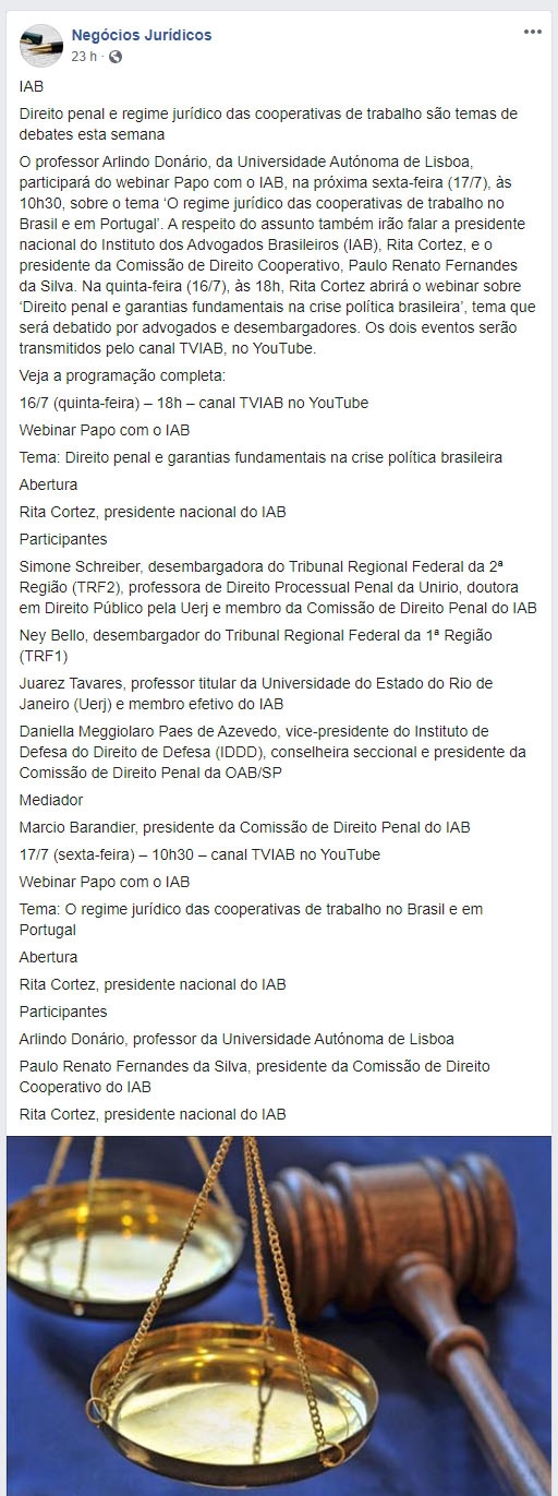 Início » IAB na imprensa » Direito penal e regime jurídico das cooperativas de trabalho são temas de debates esta semana