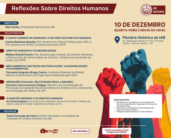 Diversos aspectos dos Direitos Humanos serão debatidos durante o evento Reflexões sobre Direitos Humanos, que o Instituto dos Advogados Brasileiros (IAB) realiza na próxima quarta-feira (10/12), no plenário da entidade, no Rio de Janeiro, com transmissão pelo canal TVIAB no YouTube. O encontro será aberto às 9h30, pela presidente nacional do IAB, Rita Cortez e terá mediação do diretor secretário e presidente da Comissão de Direitos Humanos do IAB, Paulo Fernando de Castro.