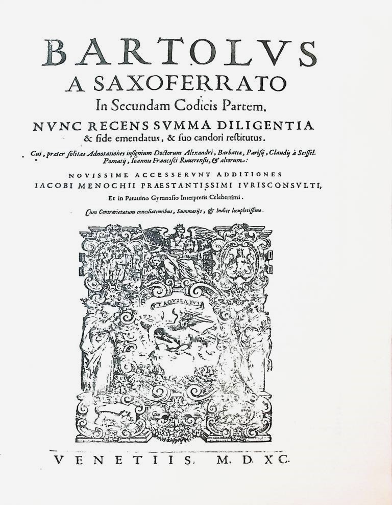 BARTOLUS, of Sassoferrato. Bartolus a Saxoferrato in secundam codicis partem, nunc recens summa diligentia & fide emendatus, & suo candori restitutus. […] Venetiis: [Società dell’Aquila che si rinnova], 1590.