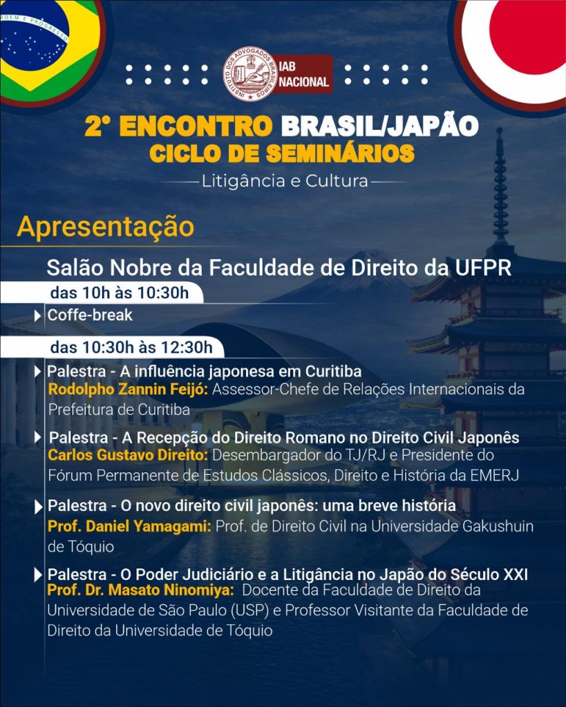 A programação conta com exposições sobre temas como a recepção do Direito Romano no Direito Civil japonês e os contrastes entre Japão e Brasil, com participação de especialistas brasileiros e japoneses. Serão palestrantes o assessor-chefe de Relações Internacionais da Prefeitura de Curitiba, Rodolpho Zannin Feijó; o professor de Direito Civil da Universidade Gakushuin de Tóquio, Daniel Yamagami; o professor visitante da Faculdade de Direito da Universidade de Tóquio Masato Ninomiya e o desembargador do Tribunal de Justiça do Rio de Janeiro (TJRJ) Carlos Gustavo Direito.