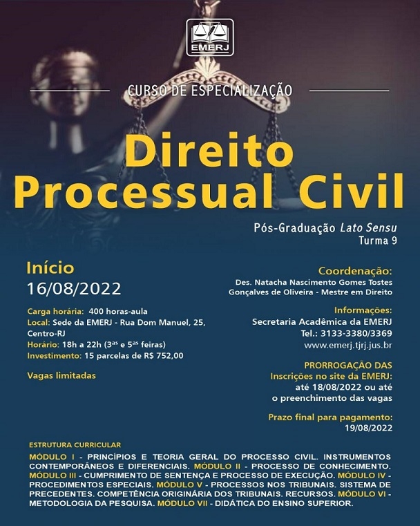PRORROGAÇÃO das inscrições on-line no site da EMERJ até 18/08/2022 ou até o preenchimento das vagas.