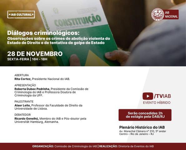 O evento Diálogos criminológicos, promovido pelo Instituto dos Advogados Brasileiros (IAB), terá como tema as observações sobre os crimes de abolição violenta do Estado de Direito e de tentativa de golpe de Estado. Ele acontecerá nesta sexta-feira (28/11), às 16h, e terá palestra do professor da Faculdade de Direito da Universidade de Lisboa Alaor Leite. Com transmissão pelo canal TVIAB no YouTube, o encontro será aberto pela presidente nacional do IAB, Rita Cortez.