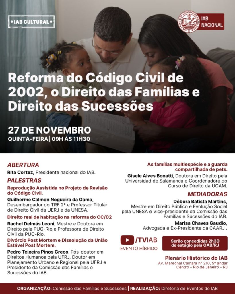 Temas como a reprodução assistida, o direito real de habitação e o divórcio e a dissolução da união estável post mortem serão temas de debate no evento Reforma do Código Civil de 2002, o Direito das Famílias e Direito das Sucessões, promovido pelo Instituto dos Advogados nesta quinta-feira (27/11), às 9h. O encontro terá transmissão pelo canal TVIAB no YouTube e será aberto pela presidente nacional da Casa de Montezuma, Rita Cortez.