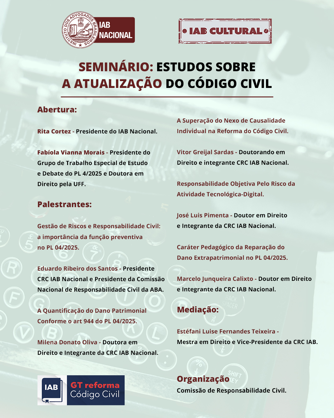 Início » Eventos » Seminário: Estudos sobre a Atualização do Código Civil – Tema:Exposição e debate de pontos relevantes sobre a Responsabilidade Civil no PL 04/2025