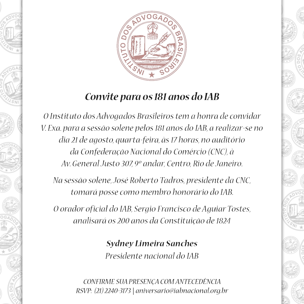 Início » Eventos » Eventos Institucionais » 2024 » Agosto 2024 » IAB | Convite para os 181 anos do IAB
