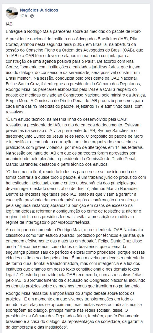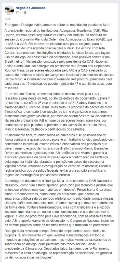 Início » IAB na imprensa » IAB entrega a Rodrigo Maia pareceres sobre as medidas do pacote de Moro