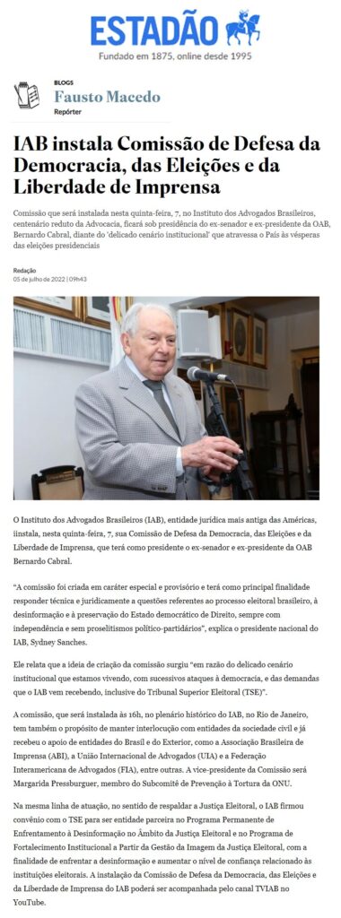 Início » IAB na imprensa » IAB instala Comissão de Defesa da Democracia, das Eleições e da Liberdade de Imprensa