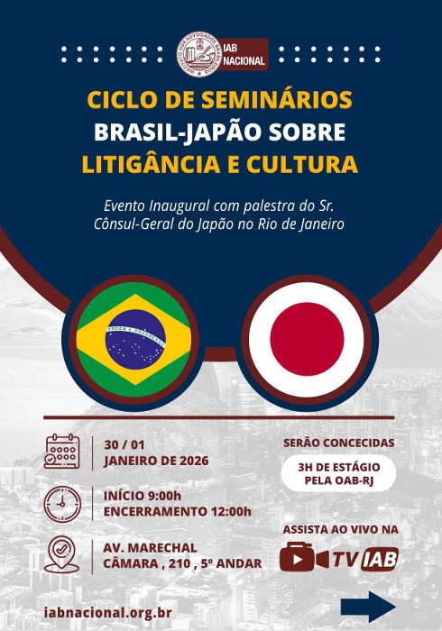 O Instituto dos Advogados Brasileiros (IAB) promoverá, no dia 30 de janeiro, a partir das 9h, o Ciclo de Seminários Brasil-Japão sobre Litigância e Cultura, evento inaugural que reunirá autoridades, magistrados e especialistas para debater imigração, cultura jurídica e relações bilaterais. O encontro será realizado em formato híbrido, com transmissão pelo canal TVIAB no YouTube. Na palestra inaugural, o cônsul-geral do Japão no Rio de Janeiro, Minas Gerais e Espírito Santo, Takashi Manabe, abordará o tema Diplomacia japonesa e os 130 anos das relações de amizade e comércio Brasil-Japão.