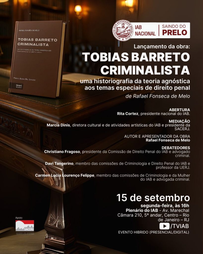 Composto de uma análise sobre a evolução da teoria agnóstica e de questões do penalismo brasileiro, o livro Tobias Barreto criminalista: uma historiografia da teoria agnóstica aos temas especiais de Direito Penal será lançado no Instituto dos Advogados Brasileiros (IAB) nesta segunda-feira (15/9), às 16h. A obra, que será apresentada pelo autor, Rafael Fonseca de Melo, também aborda o trabalho do jurista Tobias Barreto brasileiro (1839-1889). O evento terá transmissão pelo canal TVIAB no YouTube e será aberto pela presidente nacional do Instituto, Rita Cortez.