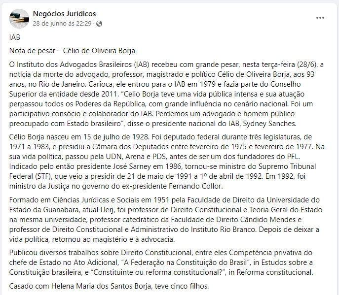IAB – Nota de pesar – Célio de Oliveira Borja