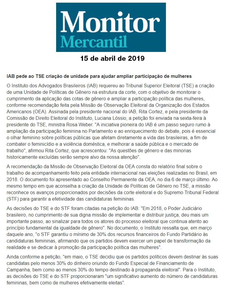 Início » IAB na imprensa » IAB pede ao TSE criação de unidade para ajudar a ampliar a participação política das mulheres