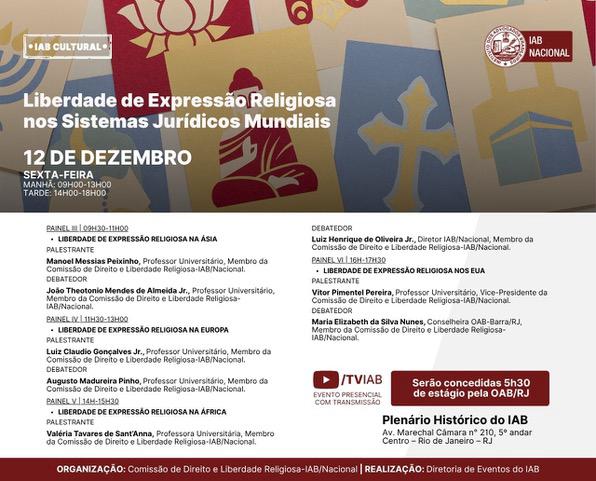A programação segue com o painel Liberdade de Expressão Religiosa na África, ministrado pela professora universitária Valéria Sant’Anna, com debate do diretor de Apoio Tecnológico do IAB, Luiz Henrique de Oliveira. Encerrando o encontro, às 16h, o professor universitário e vice-presidente da Comissão de Direito e Liberdade Religiosa do IAB, Vitor Pimentel Pereira, apresentará o tema Liberdade de Expressão Religiosa nos Estados Unidos, tendo como debatedora a conselheira da OAB/Barra Maria Elizabeth Nunes.
