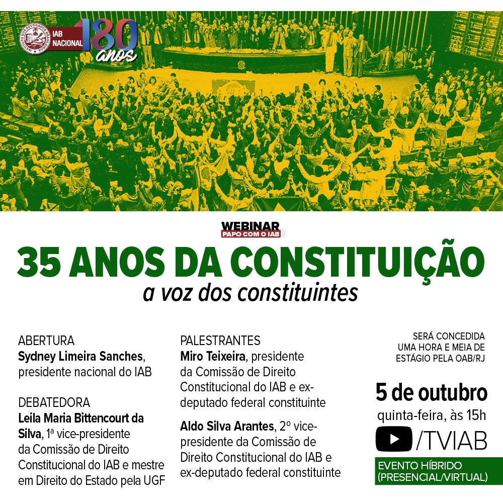 Início » Eventos » Eventos Institucionais » 2023 » Outubro » IAB | Webinar Papo com o IAB – 35 Anos da Constituição