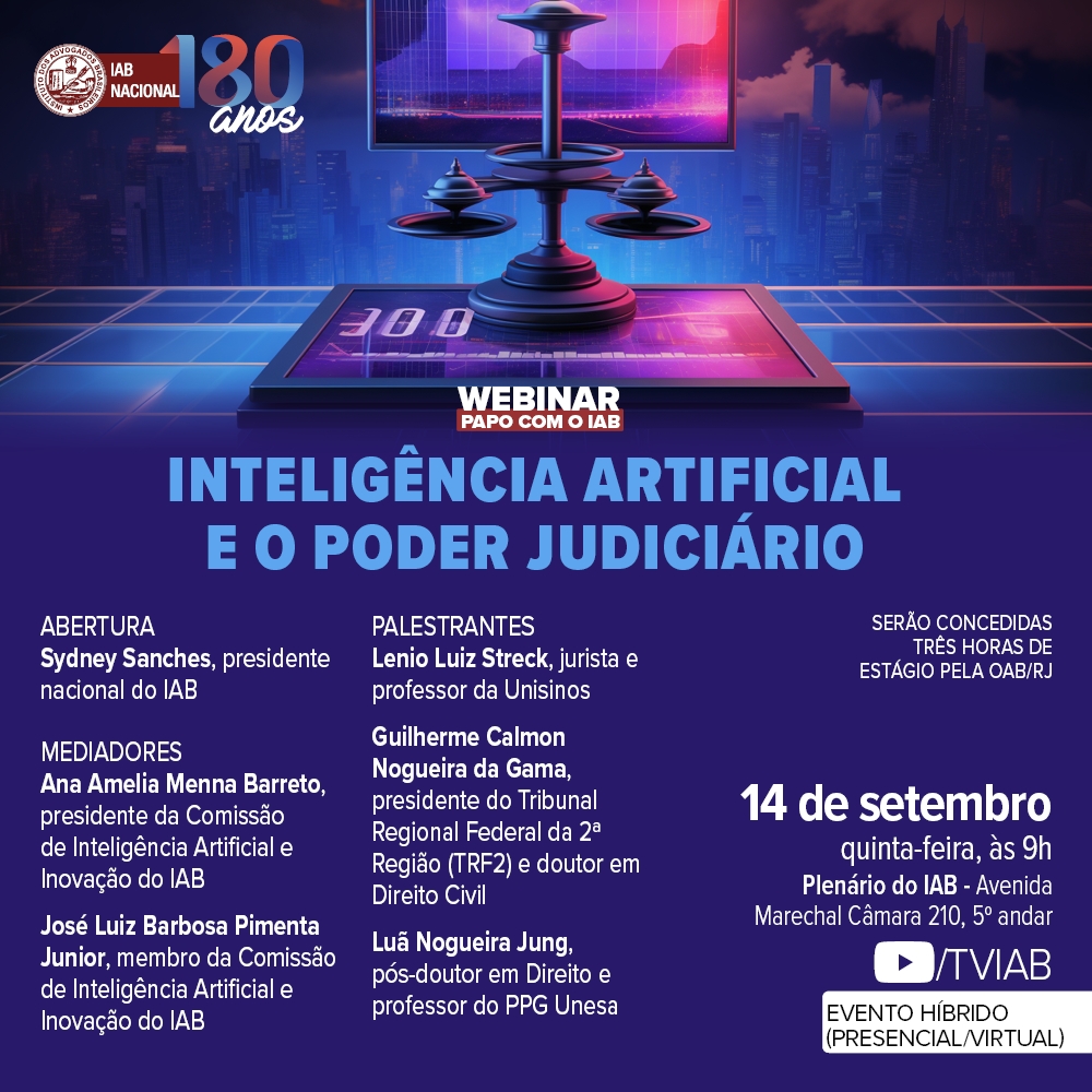 Início » Eventos » Eventos Institucionais » 2023 » Setembro » IAB | Webinar Papo com o IAB – Inteligência Artificial e o Poder Judiciário