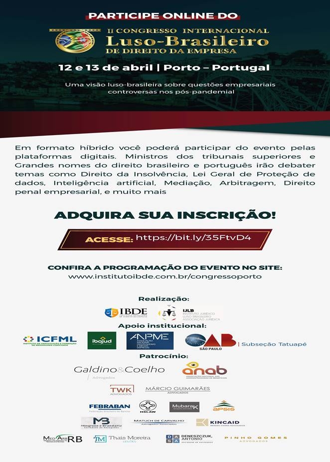 Início » Eventos » Eventos parceiros » 2022 Parceiros » Abril » [IBDE] II Congresso Internacional Luso-Brasileiro de Direito da Empresa