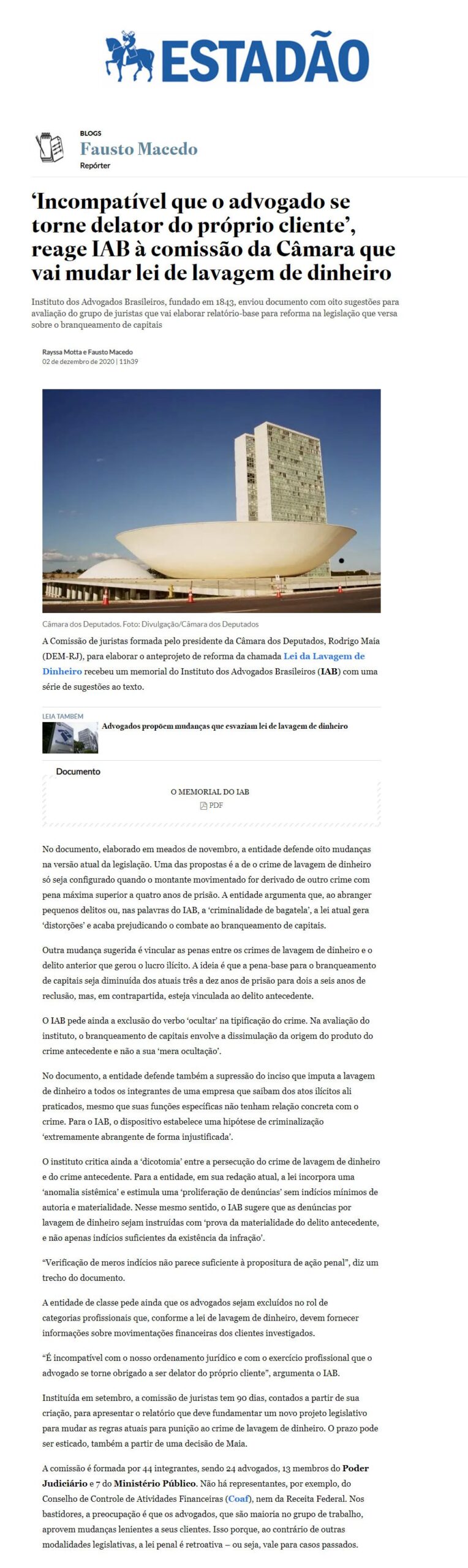 Início » IAB na imprensa » ‘Incompatível que o advogado se torne delator do próprio cliente’, reage IAB à comissão da Câmara que vai mudar lei de lavagem de dinheiro