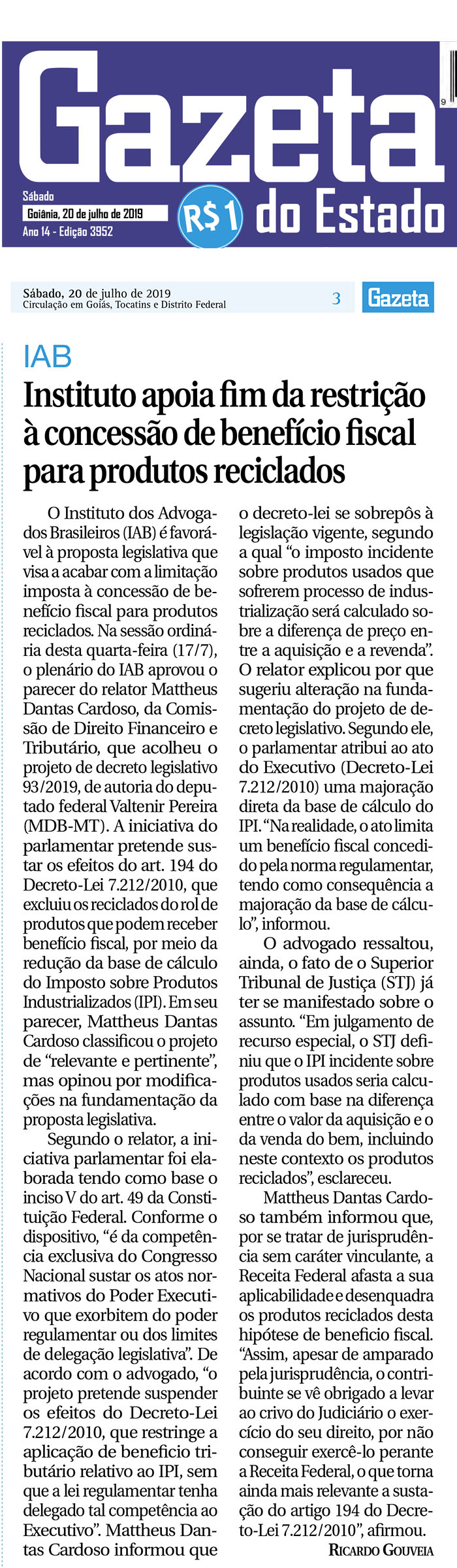 FONTE: Gazeta do Estado (GO)- 20/07/2019